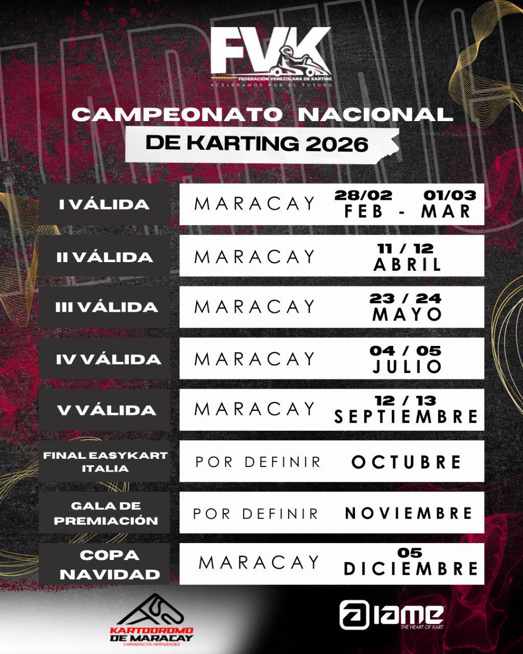 Estas son las fechas de cada una de las v谩lidas del Campeonato Nacional de Karting, temporada 2026.